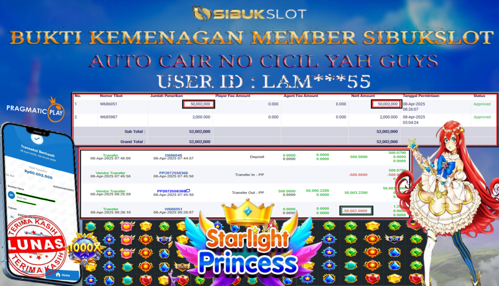 Bukti Kemenangan 8 April 2025 Di Game Starlight Princess 1000 WD 50 Juta