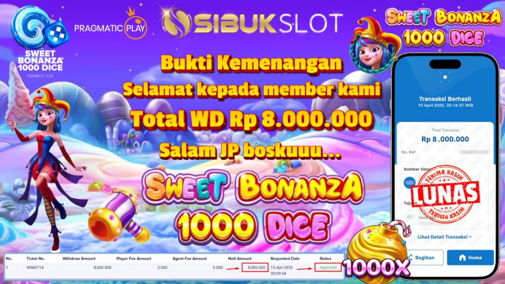 Bukti Kemenangan 15 April 2025 Di Game Sweet Bonanza 1000 Dice WD 8 Juta