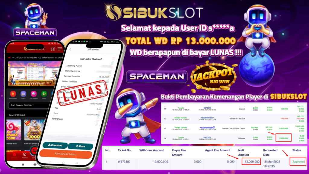 Bukti Kemenangan 18 Maret 2025 Di Game PP Live Casino Spaceman WD 13 Juta