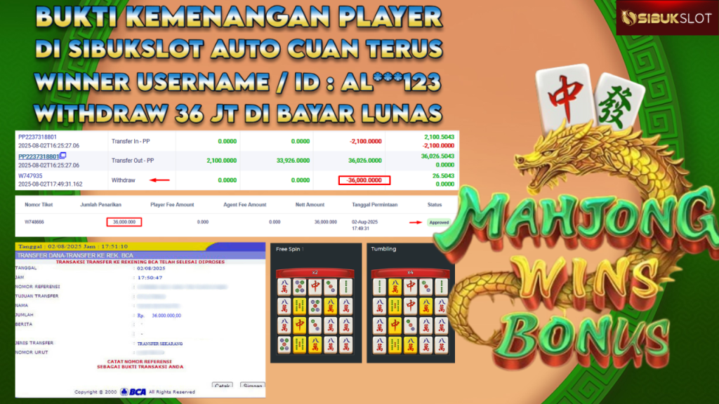 Bukti Kemenangan 2 Agustus 2025 Di Game Mahjong Wins Bonus WD 36 Juta