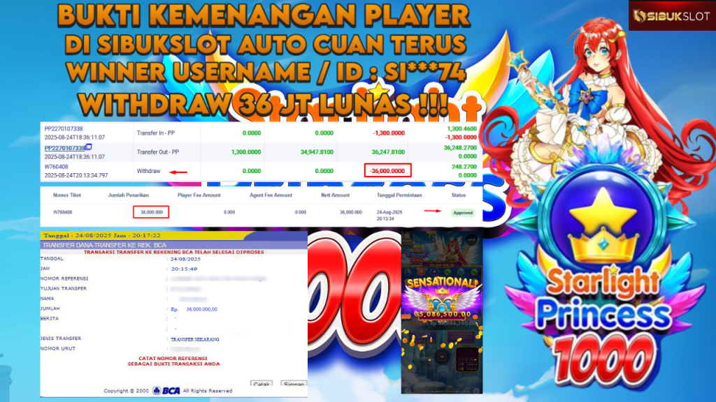 Bukti Kemenangan 24 Agustus 2025 Di Game Starlight Princess™ 1000 WD 36 Juta