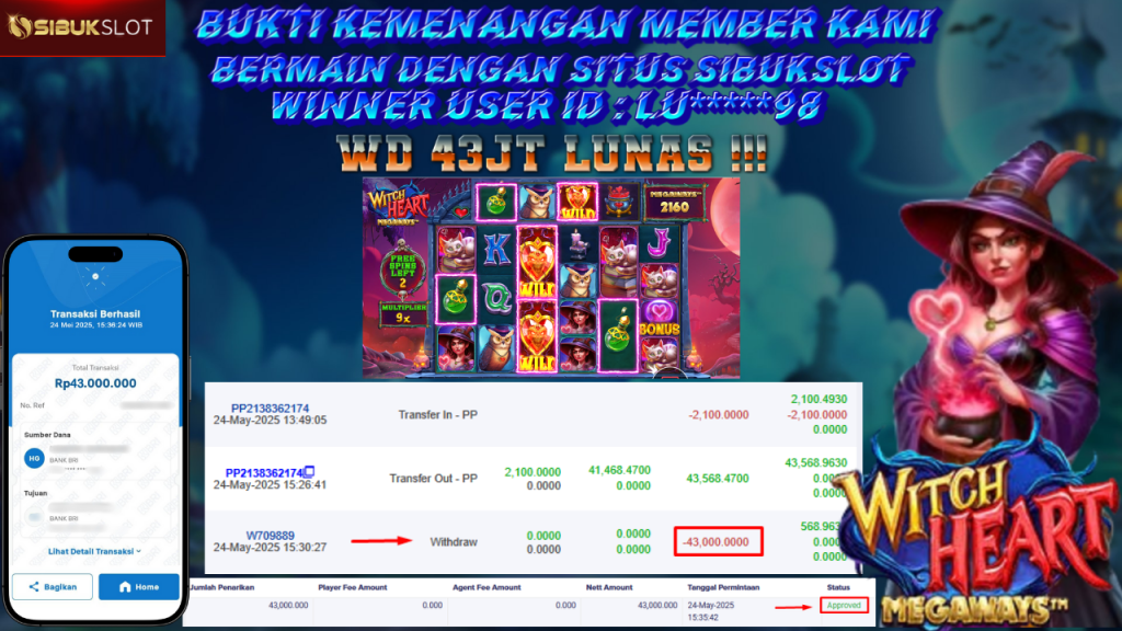 Bukti Kemenangan 24 Mei 2025 Di Game Witch Heart Megaways WD 43 Juta