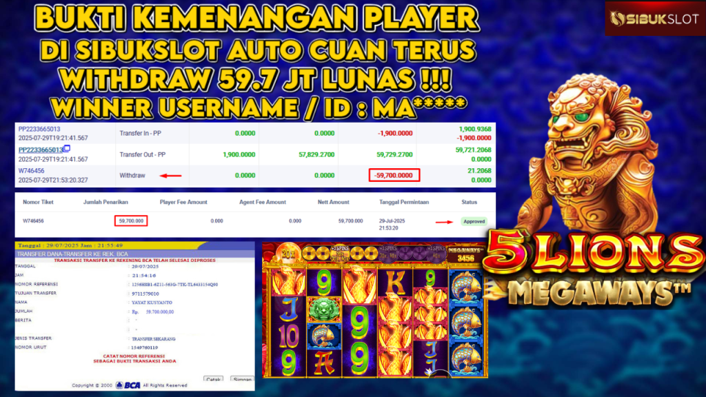 Bukti Kemenangan 29 Juli 2025 Di Game 5 Lions Megaways WD 59.7 Juta